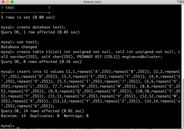 Lets go back to our multithreaded ndbd (ndbmtd) case, we will create the same table ‘t1’ again and inserts few rows into it. Then will check the partition count. The only difference this time is that, we will create the table with PARTITION BY KEY with PARTITIONS clause.
